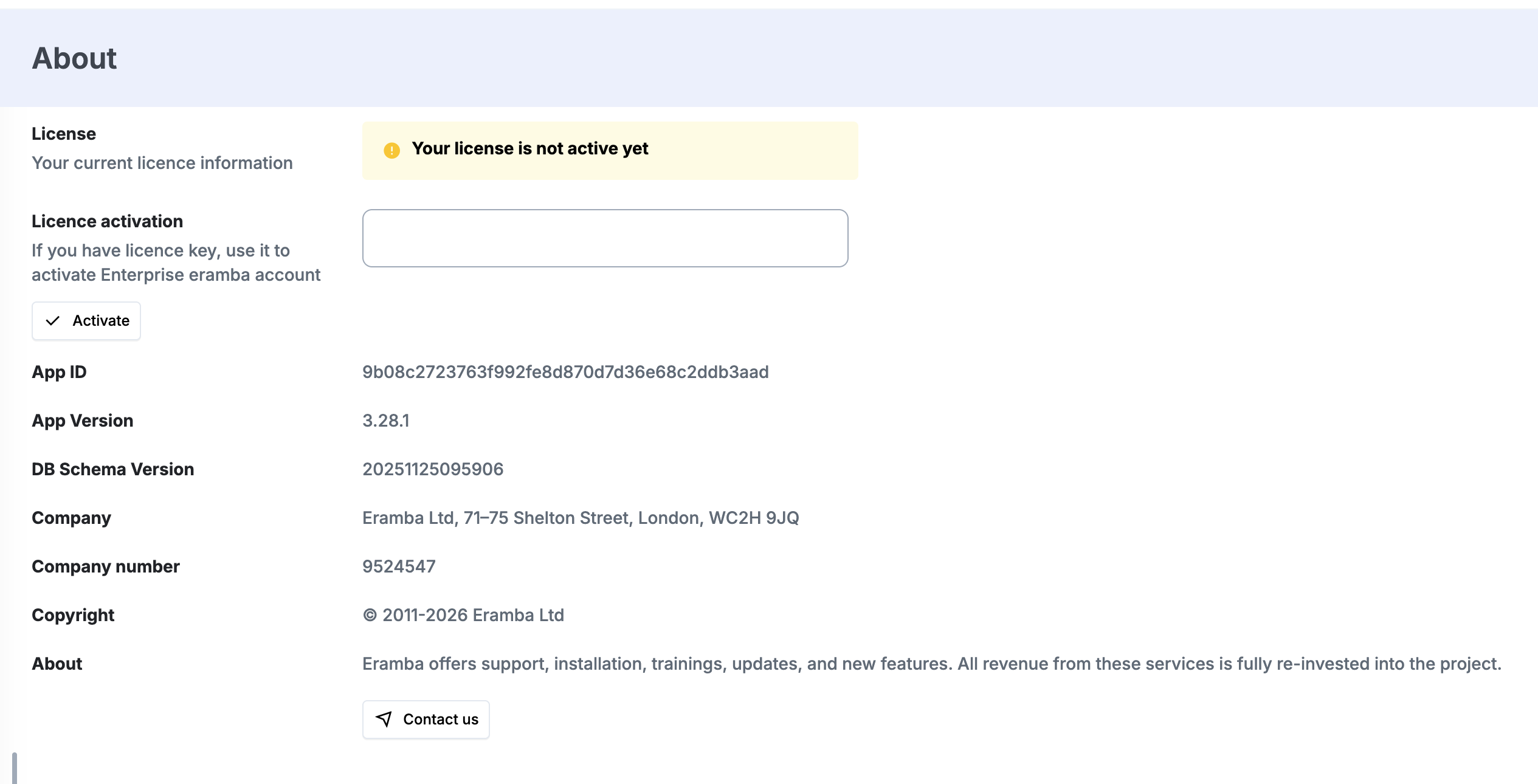 If there is some problem with activation please write an email to support@eramba.org together with the screenshot from "System" / "About"