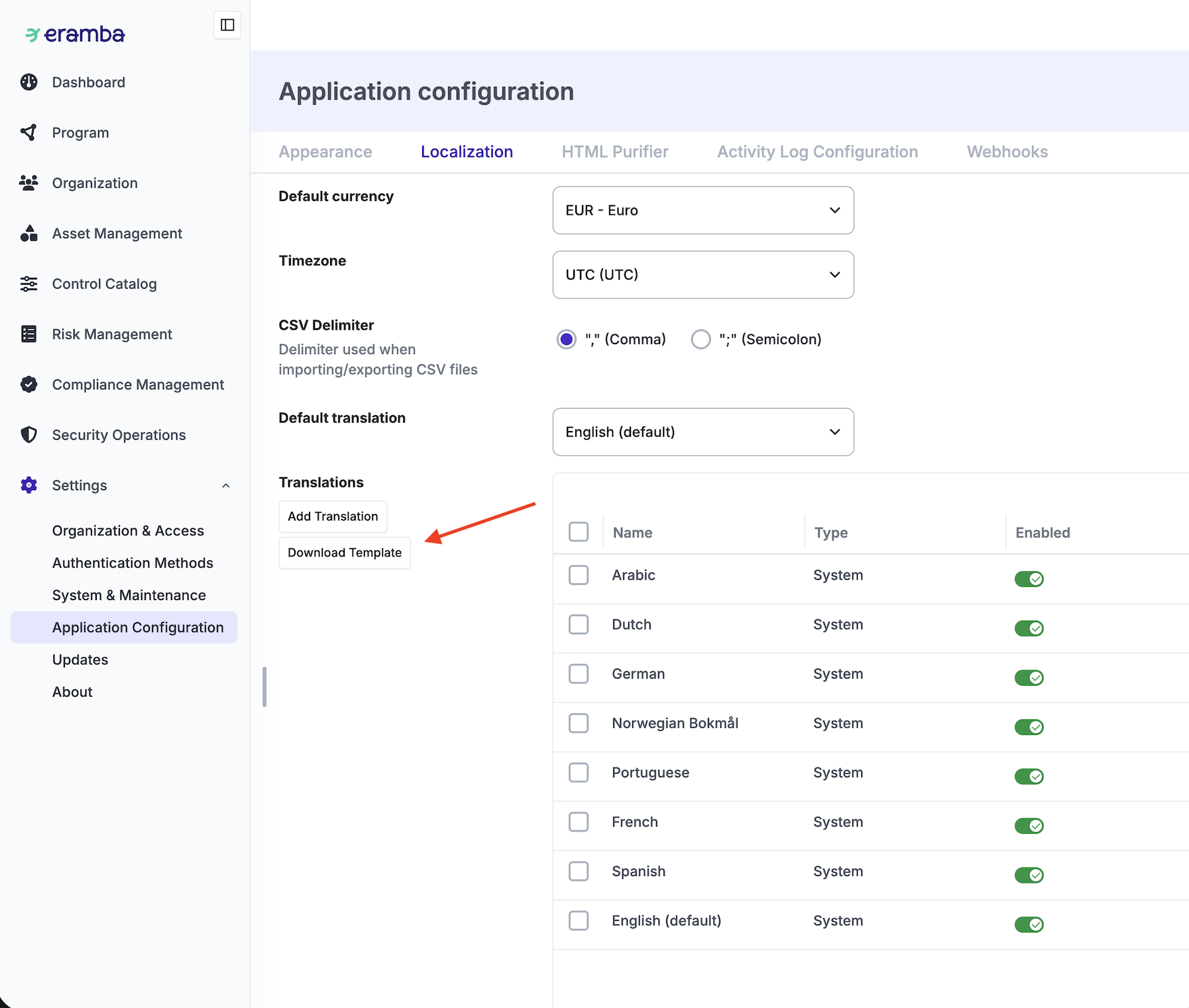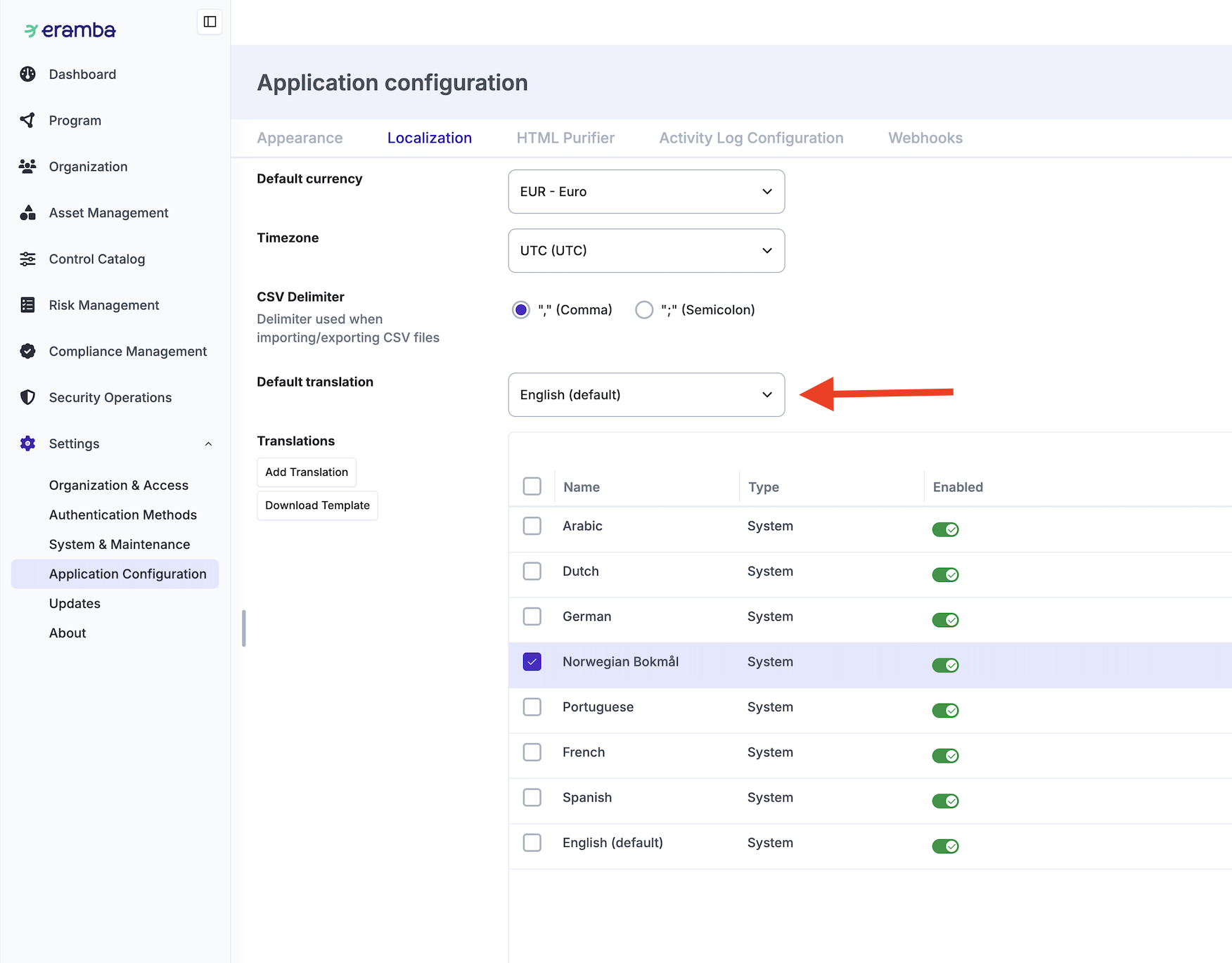 Eramba includes by default some standard translations which can be disabled (not shown at the login page) if you wish. Simply edit the translation and disabled it.