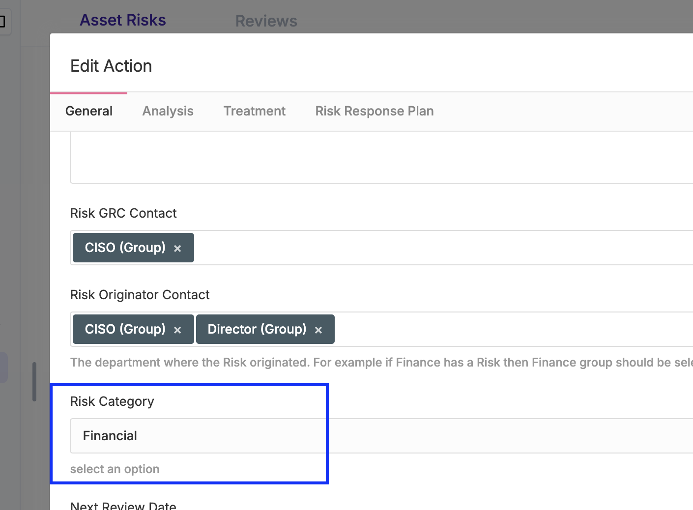 - The General tab defines the core identity and ownership of the Risk. The Risk must be described using a scenario-style title, similar to a newspaper headline, clearly stating what could happen and why it matters. Two roles are always required. The GRC Contact represents the department with an interest in creating and managing the Risk and is typically responsible for its governance and ongoing oversight. The Risk Originator represents the department whose activities generate the Risk, intentionally or unintentionally, and is usually identified during interviews or risk identification workshops. The Risk Review is a mandatory field that is used to force you to perform a review of this risk on the specified date.