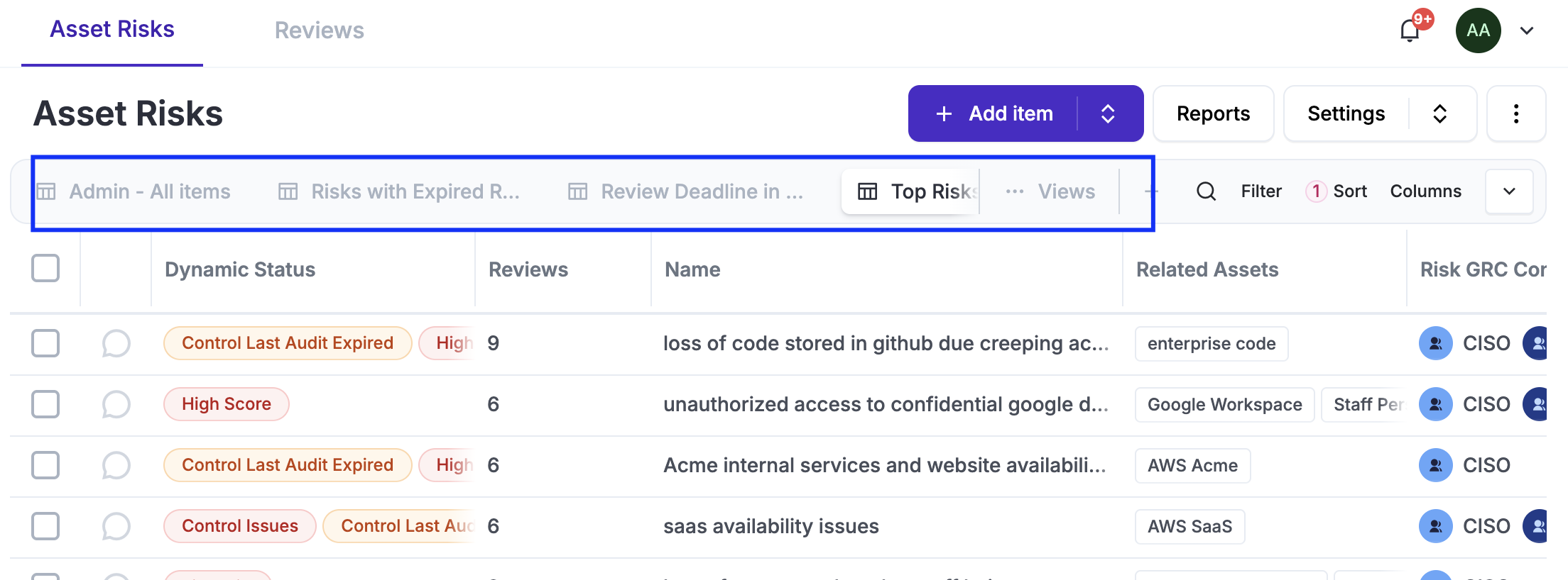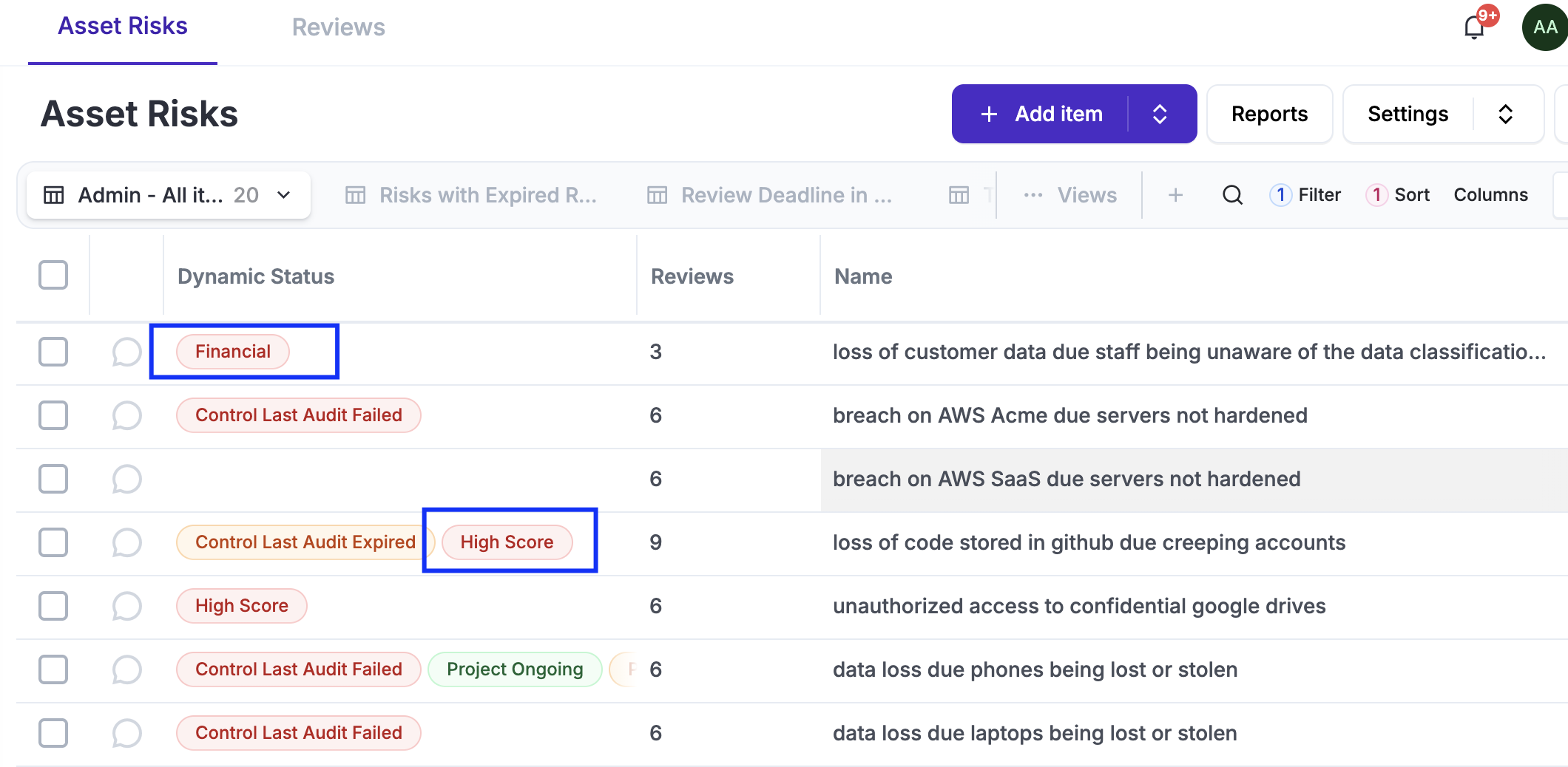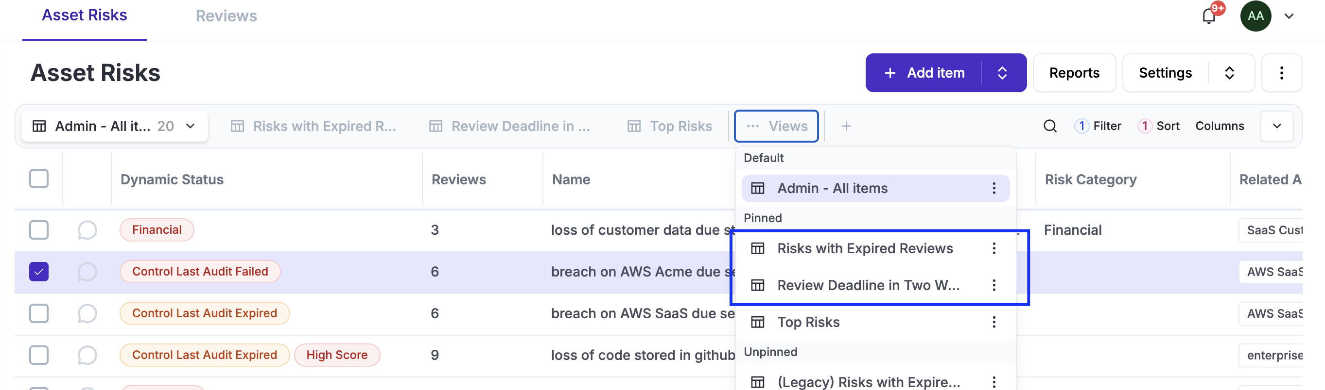 All reviews are stored in the Reviews tab. You can use shortcuts that, when clicked, will filter the full list to show only the reviews applicable to your selected risk.