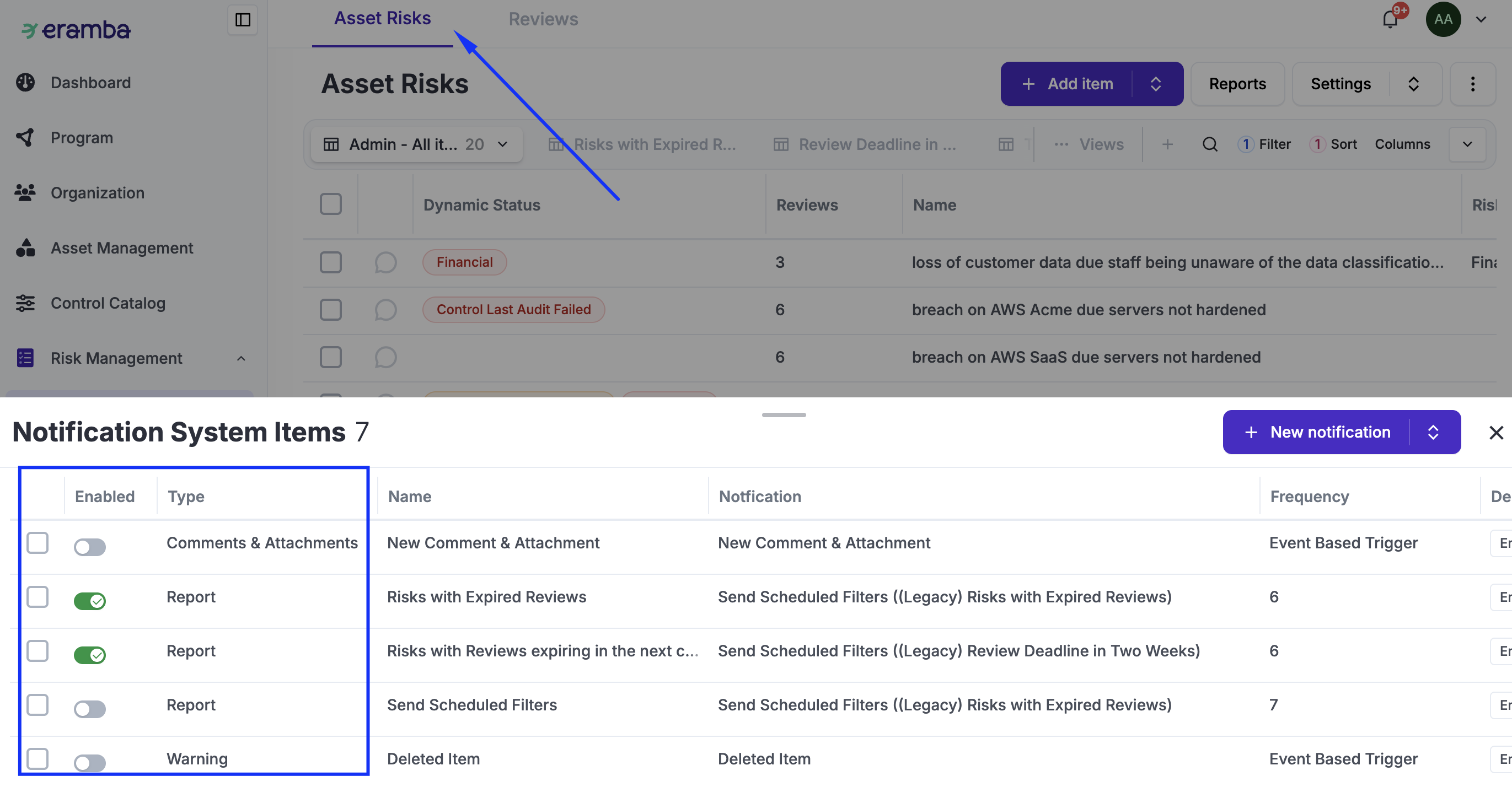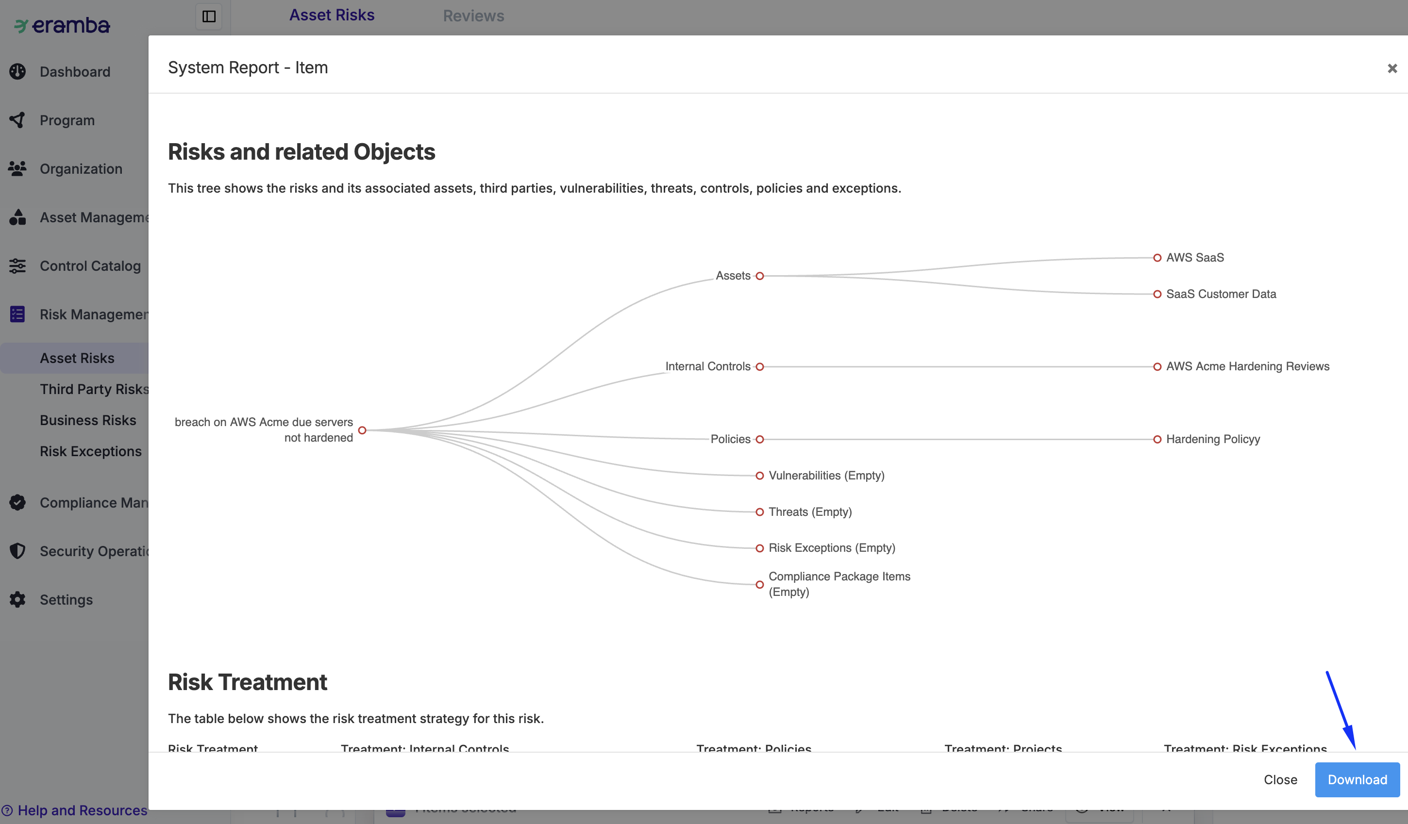 A risk in eramba has multiple related items (Controls, Assets, Exceptions, Policies, etc.), and all of them must be reviewed or tested to ensure they perform as expected.