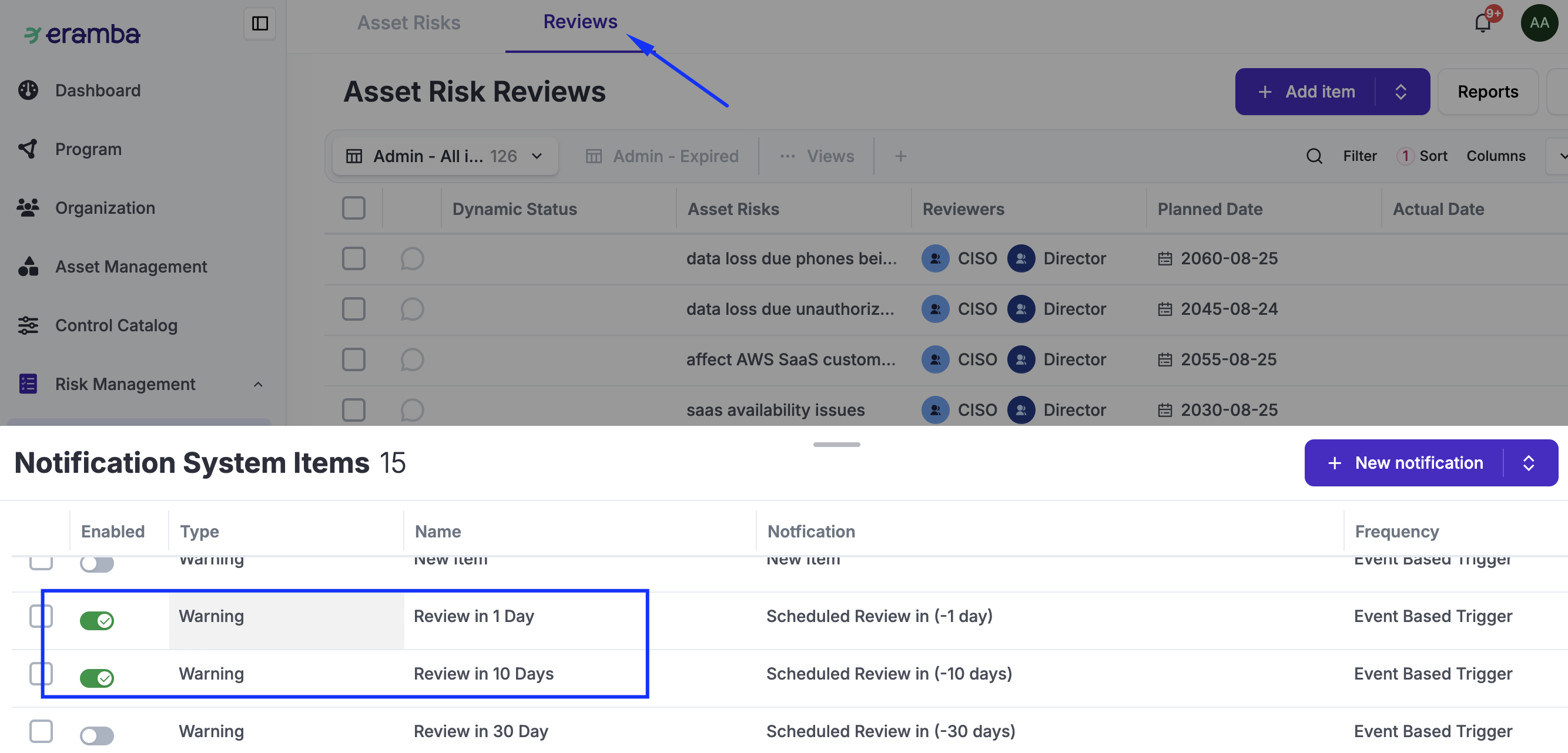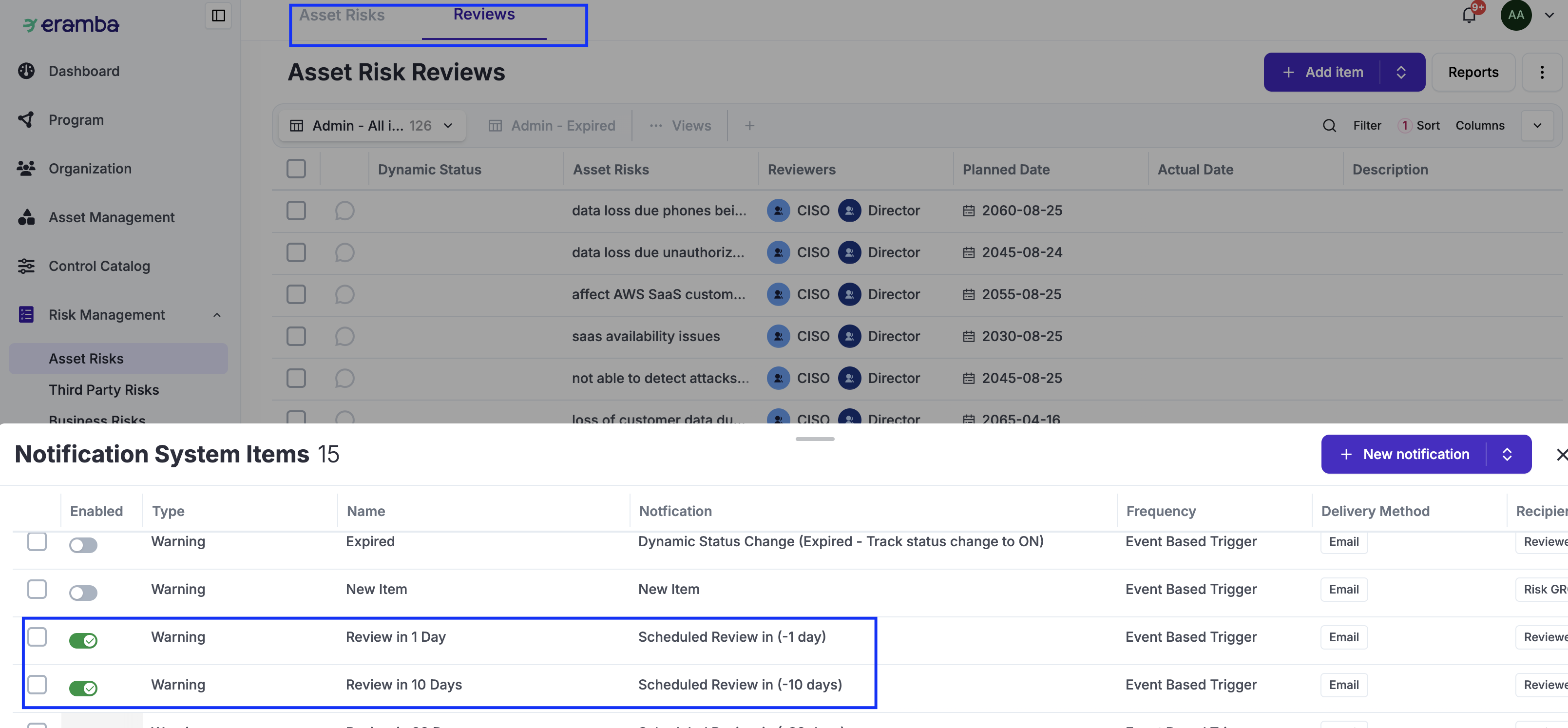 Based on that deadline, eramba will automatically create two Review records for every new Risk you create: