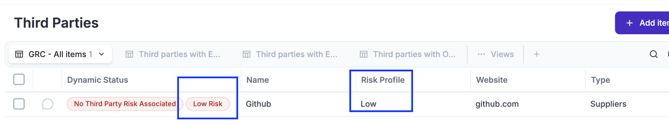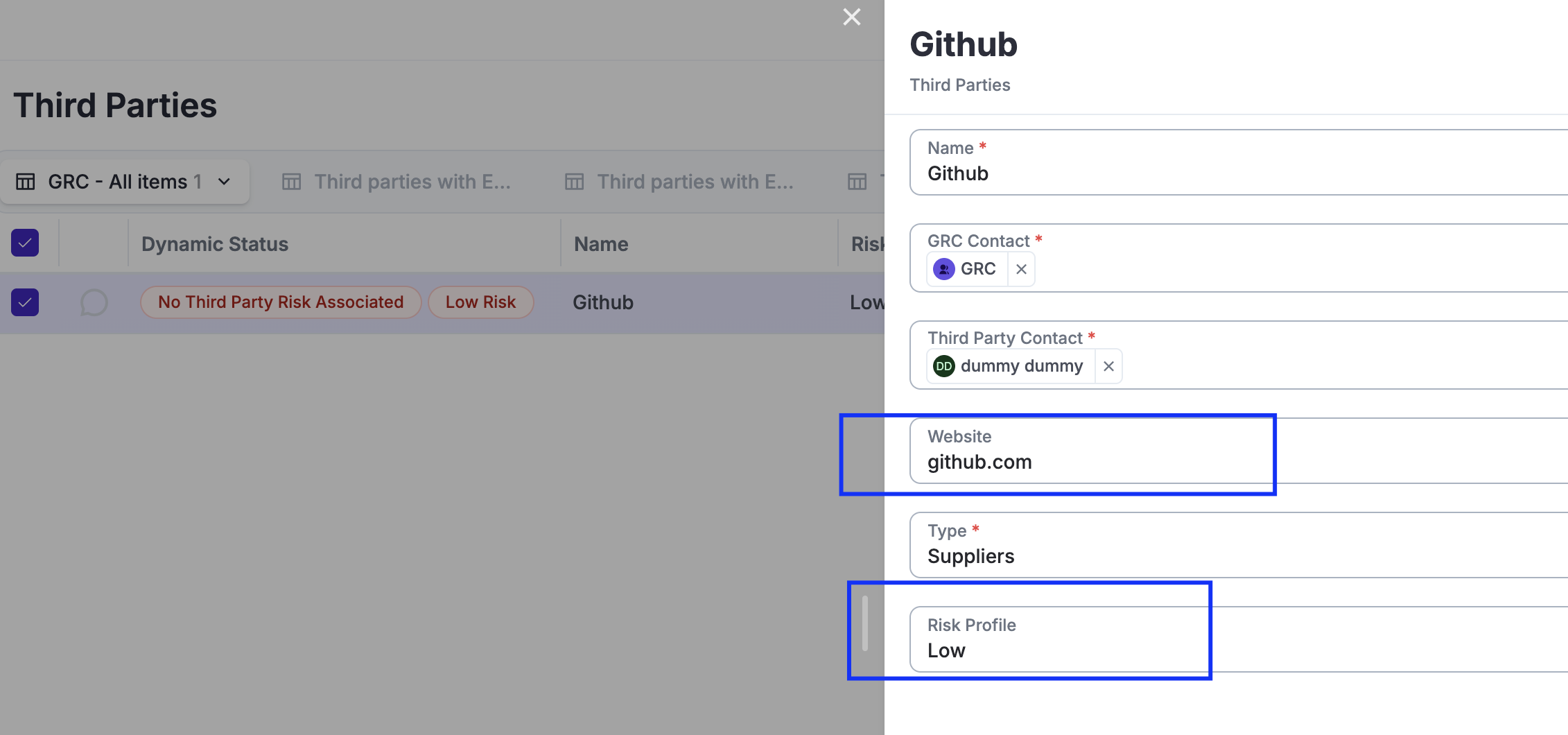 After the OA process has been concluded, you will see, if configured, Dynamic Statuses showing on the Third Party module indicating the associated OAs are completed, etc. If you configured Custom Fields for highlighting attributes such as Risk, etc for this supplier, you can now edit and update them.