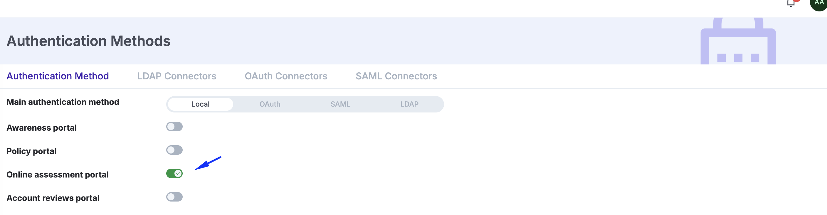 Enable the OA portal at System / Settings / Authentication and enable the Online Assessment switch
