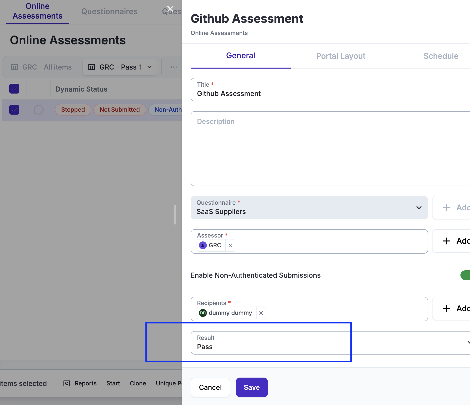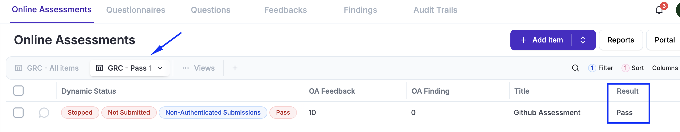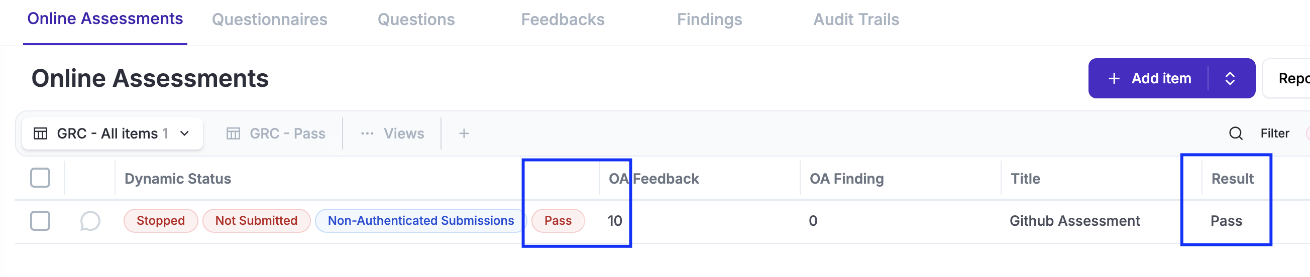 OA Results: The final assessment result (e.g., Pass, Failed, etc.) can be stored in a Custom Field. This result can then be inherited by your Third Party records for centralized tracking.