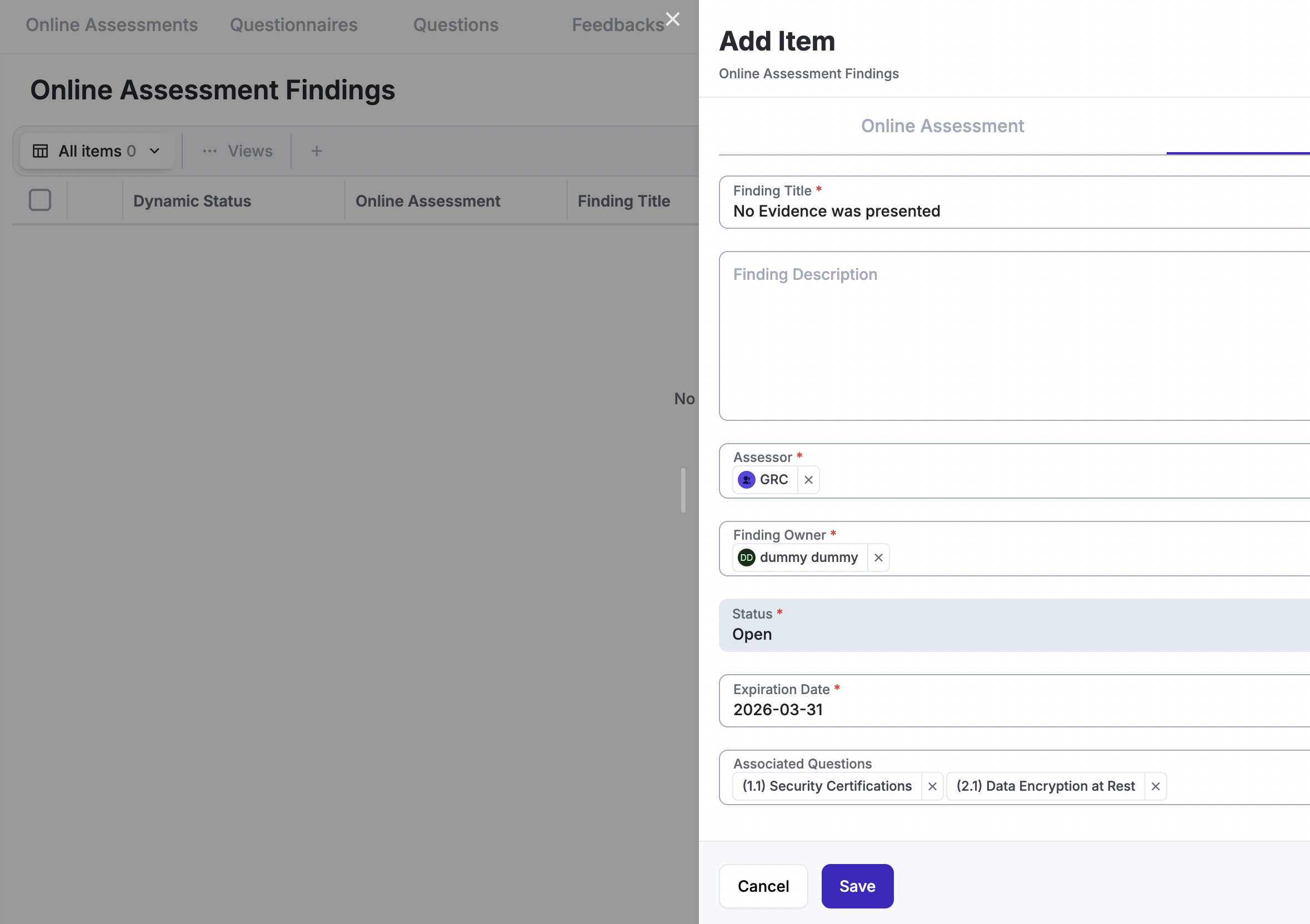 After you complete the review, you might want to document issues or gaps that were identified; we do that in the form of Findings. These findings are linked to the specific OA and, optionally, to one or more individual questions within that OA.