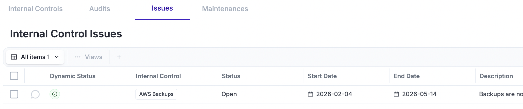 An Internal Control can have one or more Issues associated with it, which will be displayed on the "Issues" tab. An Issue is a simple record where the Status (Open/Closed) indicates if it is still applicable, and the Start/End dates help you understand for how long the issue was active.