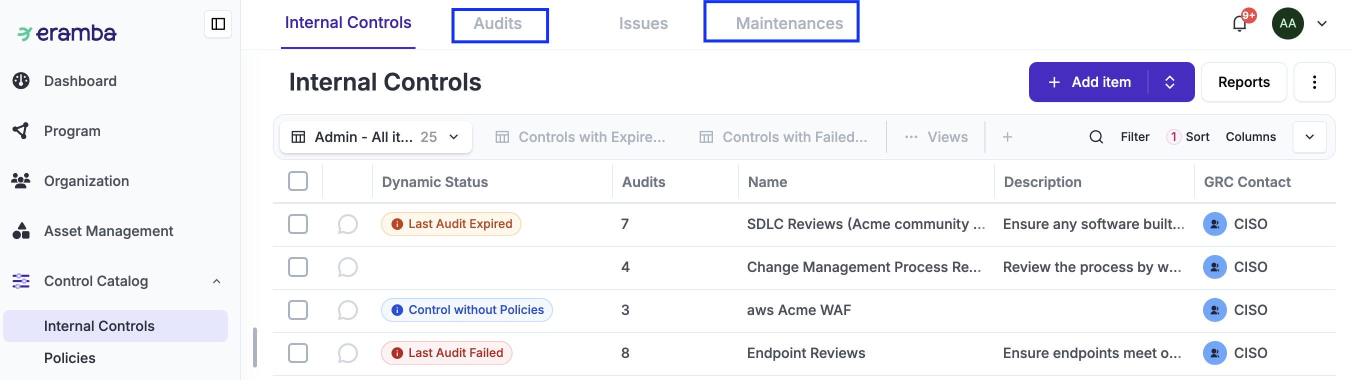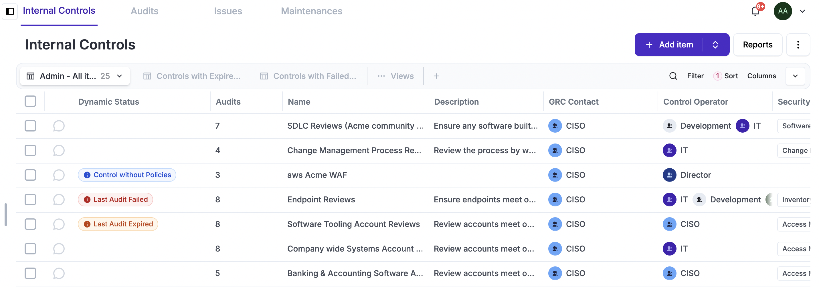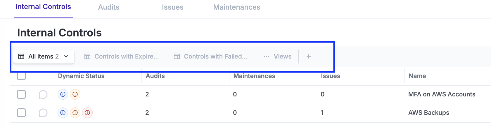 In each of the tabs (Internal Controls, Issues, Audits, etc.), you will most likely define your own Views to simplify access to commonly used information—such as expired, failed, or pending audits.