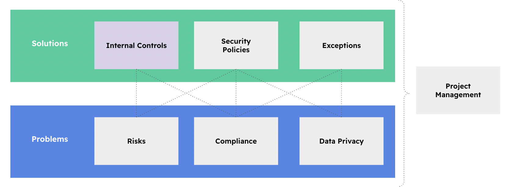 You can think of the gray boxes (and the pinkish one) as modules in Eramba, which are roughly grouped into two categories: Solutions and Problems. The reason most GRC professionals have a job is because there are problems in the organization where they work; in Eramba, those are primarily Risks, Compliance Requirements, and Data moving around.