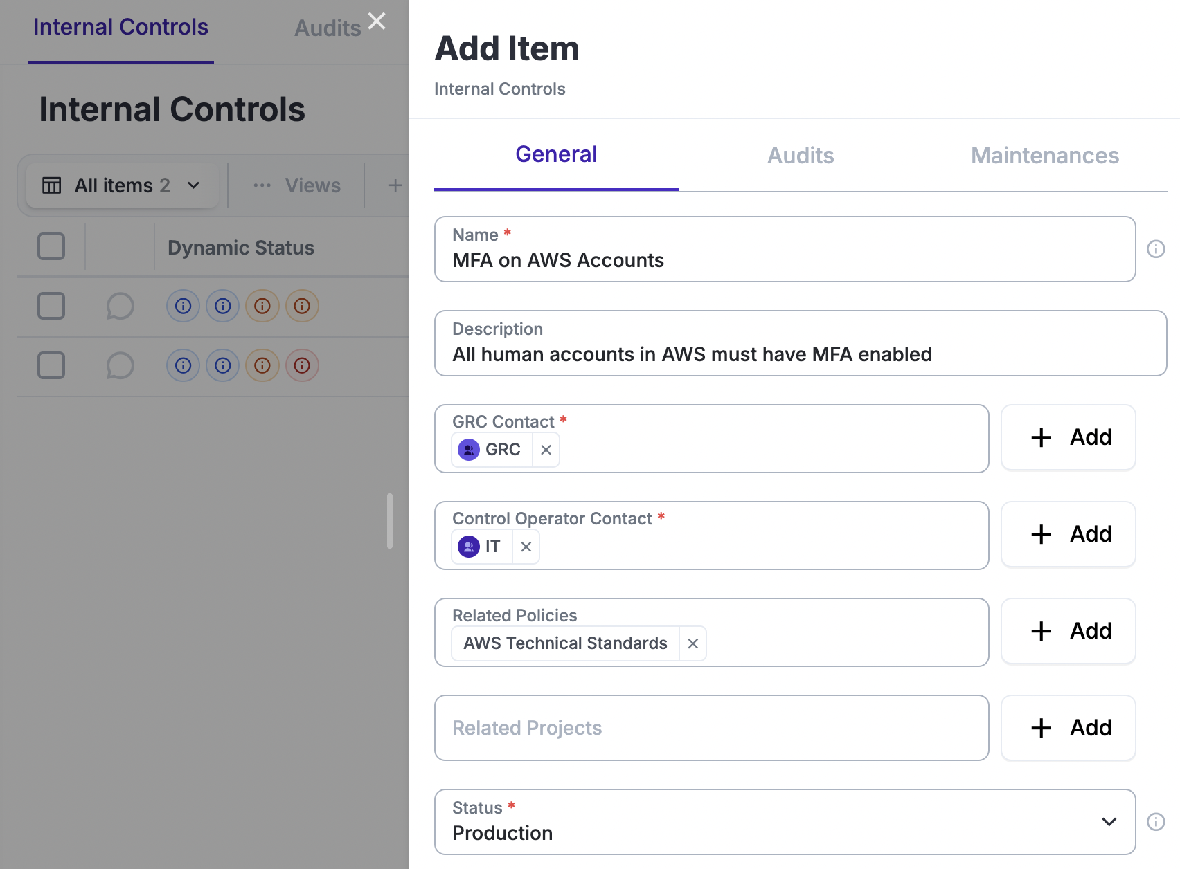 Document the Basics: Create your real Internal Controls using only a Title, Description, Operator/Owner, and (optionally) a Policy. We strongly recommend skipping Audits and Maintenances at this stage unless you are an experienced user.