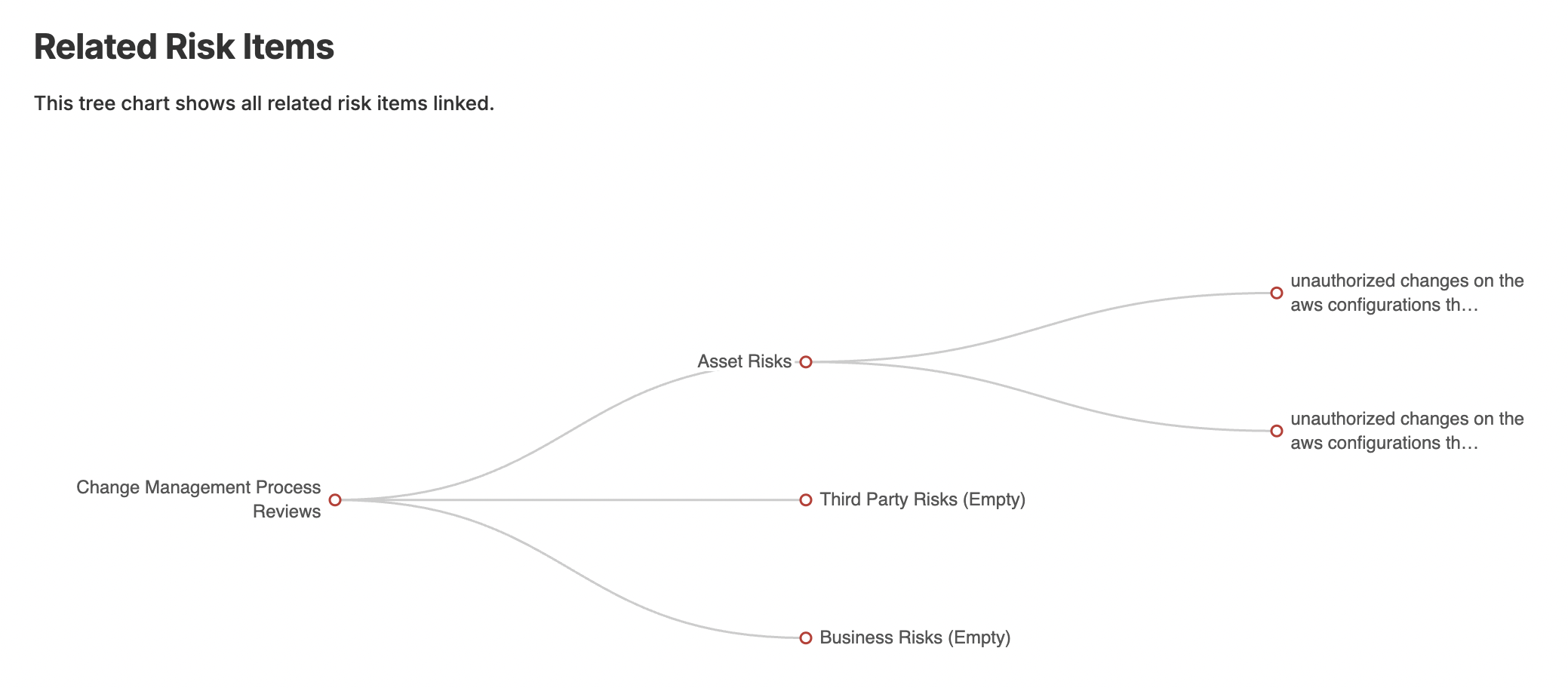 The screenshot below is from a basic Internal Control report in eramba that shows how the Internal Control "Change Management Process Review" ties to two Risks.