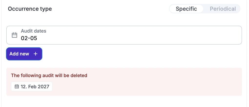 After saving, eramba will automatically create audit records for the current and next calendar year (January–December). For example, if you define testing on May 5th and December 12th, and the day you click "Save" is June 5th, eramba will: