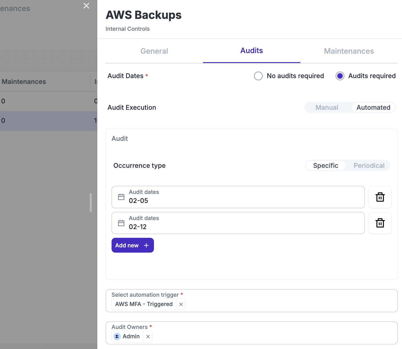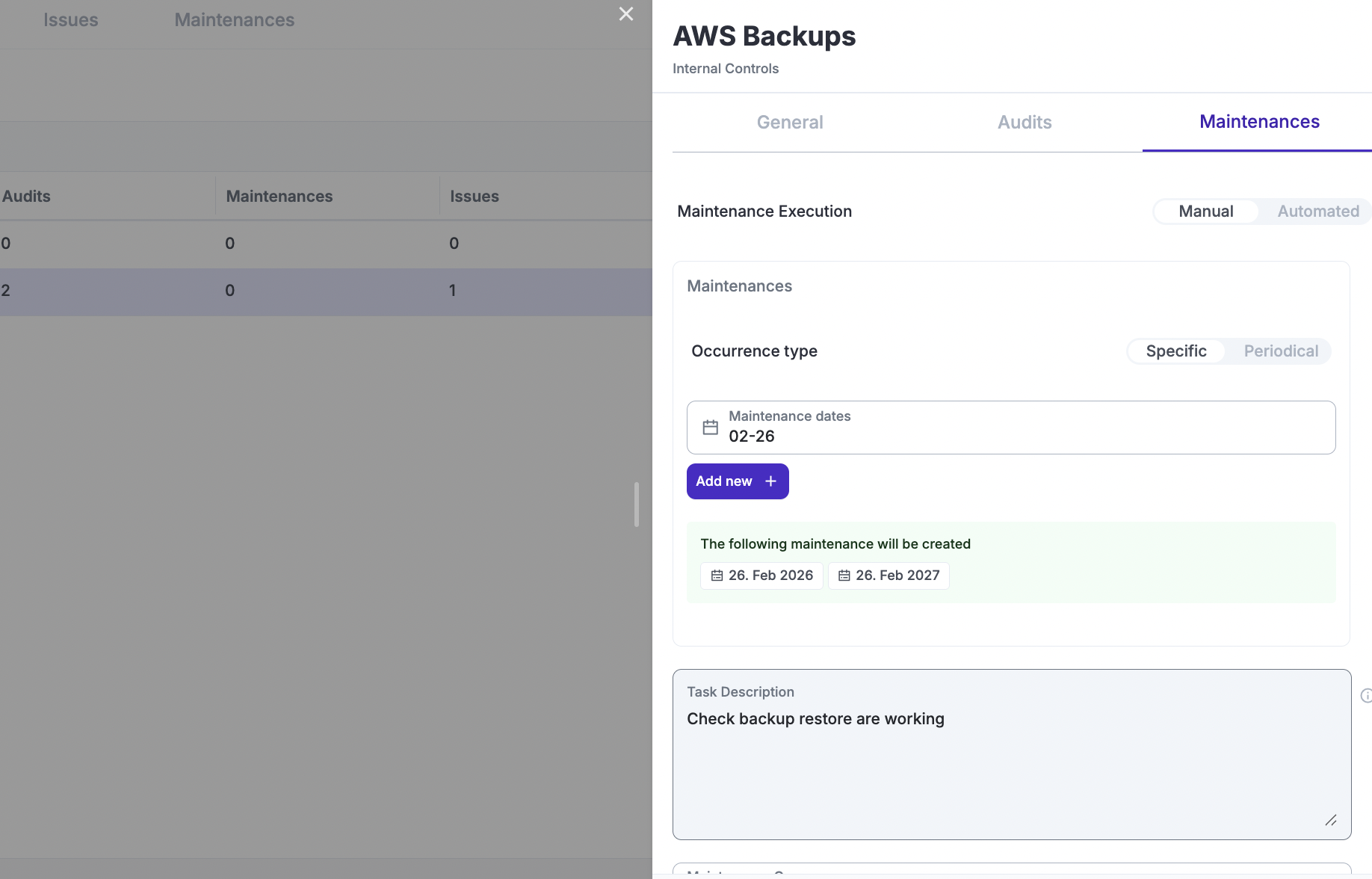 Maintenances work exactly the same way as Audits. The only difference is in the records stored: instead of an audit methodology and success criteria, you need to provide a description of the maintenance task.