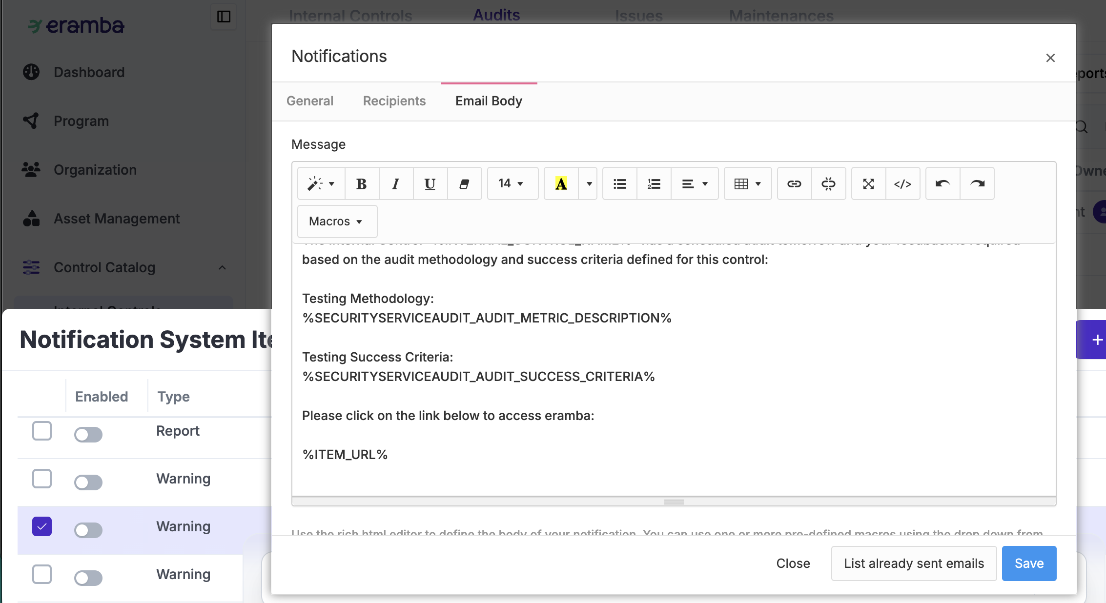 Built-in Macros in the notifications allow you to include specific attributes from the audit directly in the email, such as the Evidence Required description. There are many other types of Warning notifications you can customize to keep your team informed, for example: