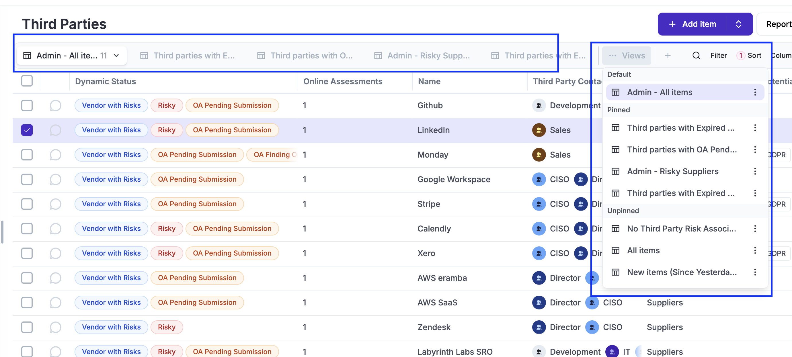 You will create default views for yourself on most modules, typically grouping data using filters, often based on custom fields. Eramba ships with multiple default views on each module which are not pinned by default.