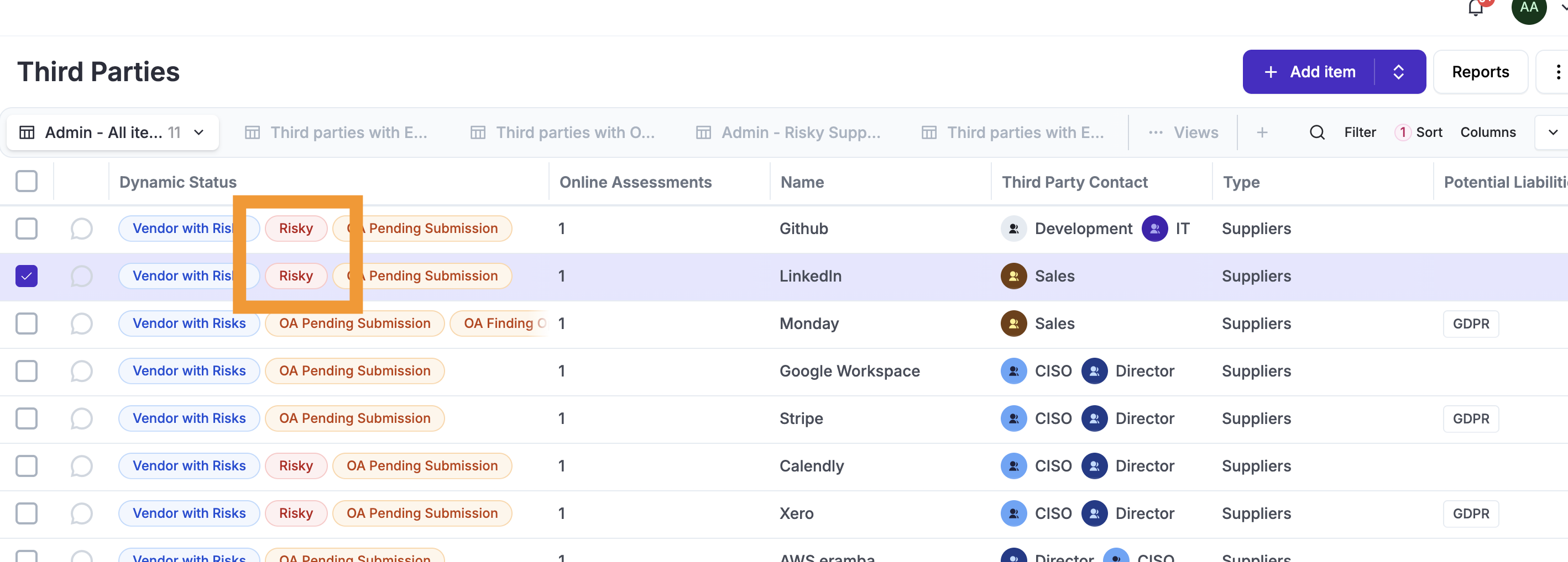 Third Parties: List of third parties without Online Assessments, List of third parties without associated Risks, List of third parties with Failed Online Assessments.
