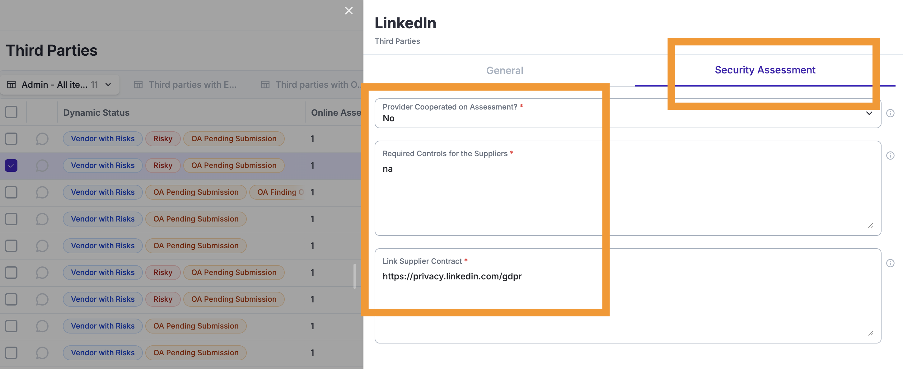 Third parties: supplier email/website, supplier criticality, cooperation with the assessment, etc.