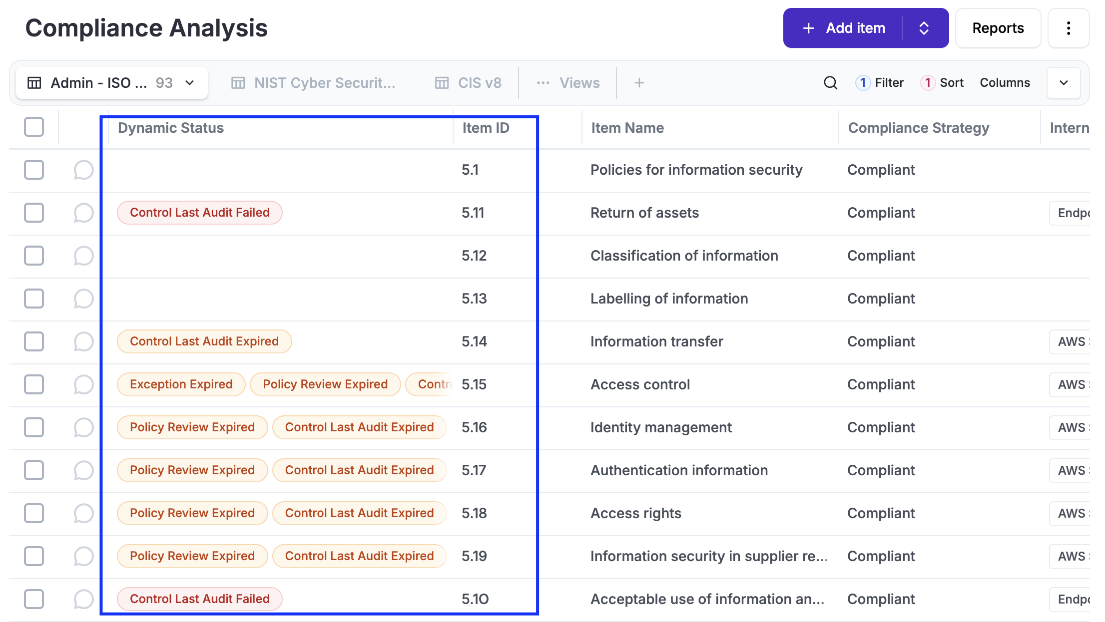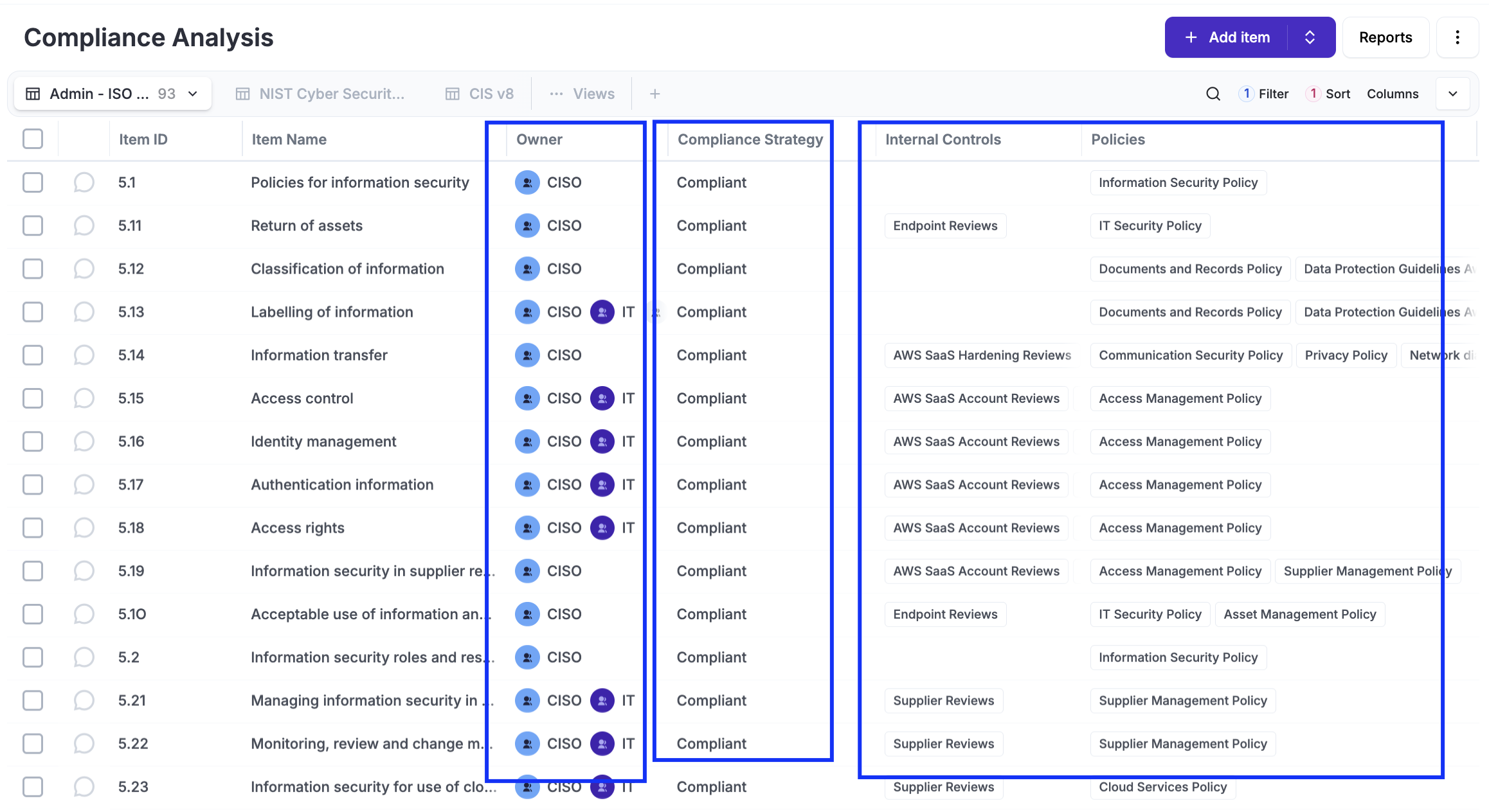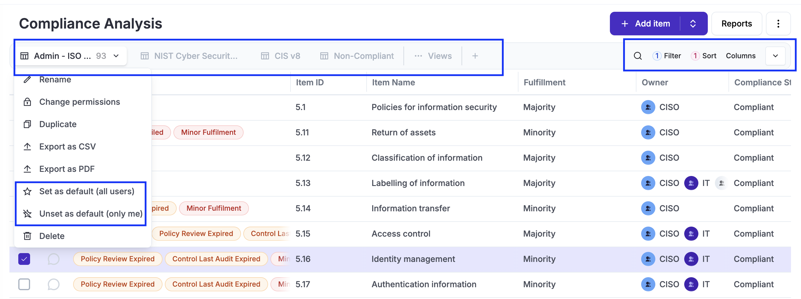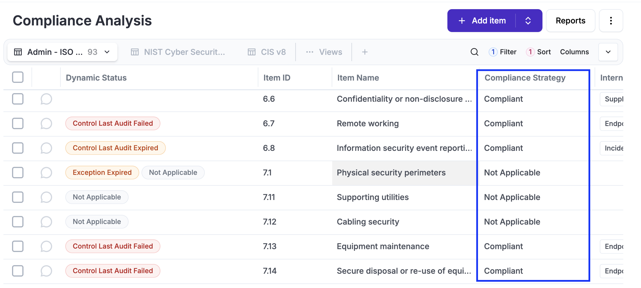 As you identify Internal Controls and Policies as part of the “Compliance Analysis” phase, you often do not know exactly if these items are “mature” or not, meaning if they are really solutions. Sometimes it is a good idea to create a simple custom field with a dropdown called “Maturity” with basic options: Unknown (Default), OK, NOT OK. Then, using Dynamic Statuses, views, and reports, you can track the percentage of these items.