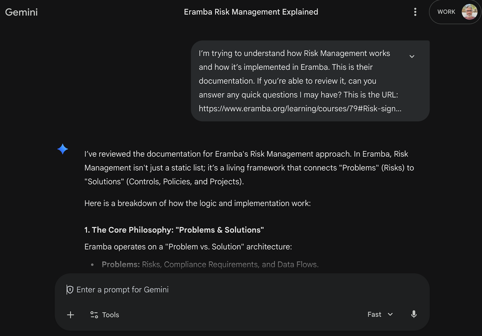 I’m trying to understand how Compliance Management works and how it’s implemented in Eramba. This is their documentation. If you’re able to review it, can you answer any quick questions I may have? This is the URL: (paste url here)