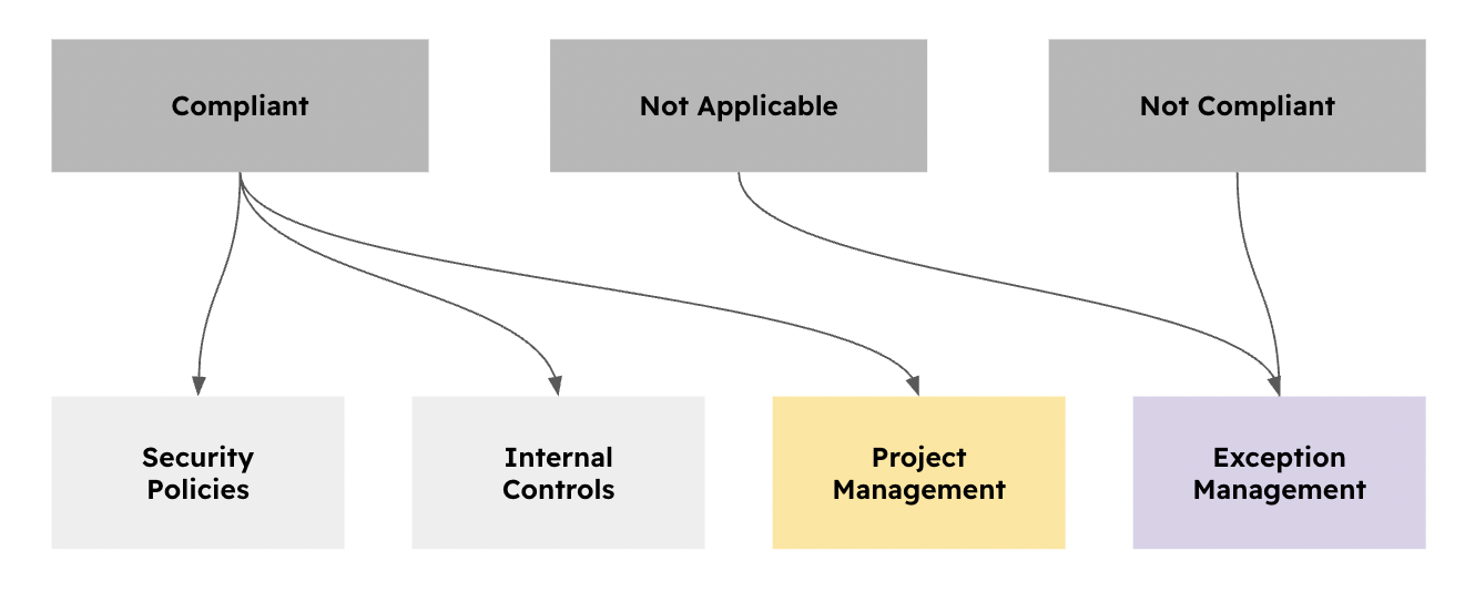 Exceptions: These are used when a Compliance requirement is intentionally not treated because the requirement is not applicable to you. For example, if your company for some reason does not use endpoint computers (it would be strange, right?), this would not apply to you. (Exception module documentation)