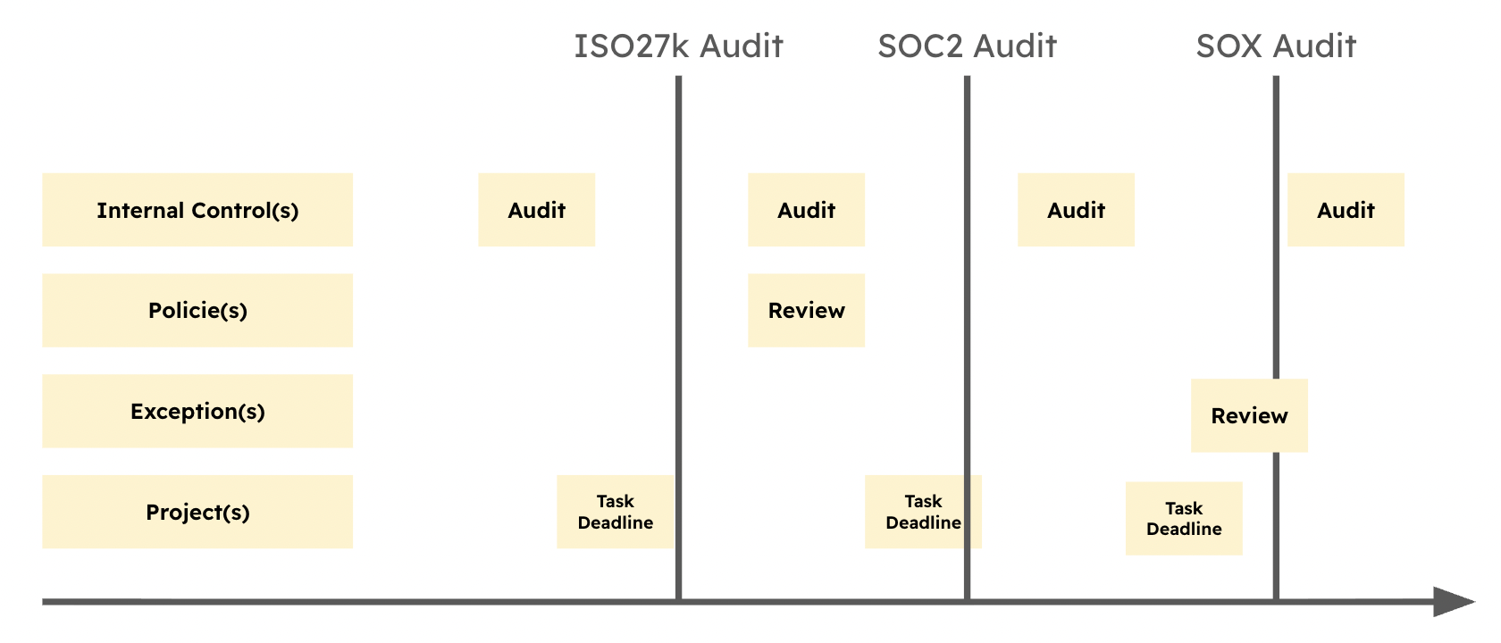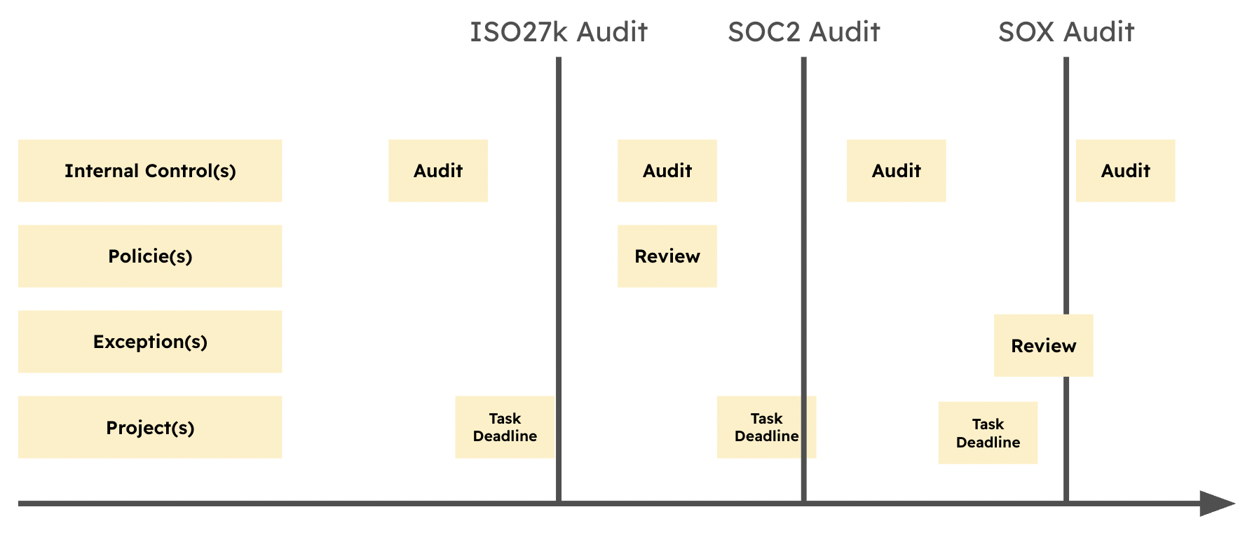 The idea is that you can demonstrate compliance throughout the year. For this, the “Solutions” (in particular Internal Controls) will be audited. Policies will be reviewed. Exceptions will be reviewed. Projects will be followed up.