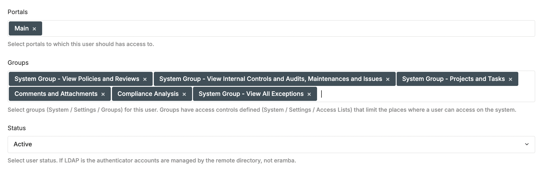 This involves the creation of user accounts for each department created during the “Access Phase”. This will help these people log in to Eramba and see Compliance Requirements, Internal Controls, Policies, Projects and Exceptions assigned to them, provide feedback for Risks, and perform any other tasks you wish them to perform.