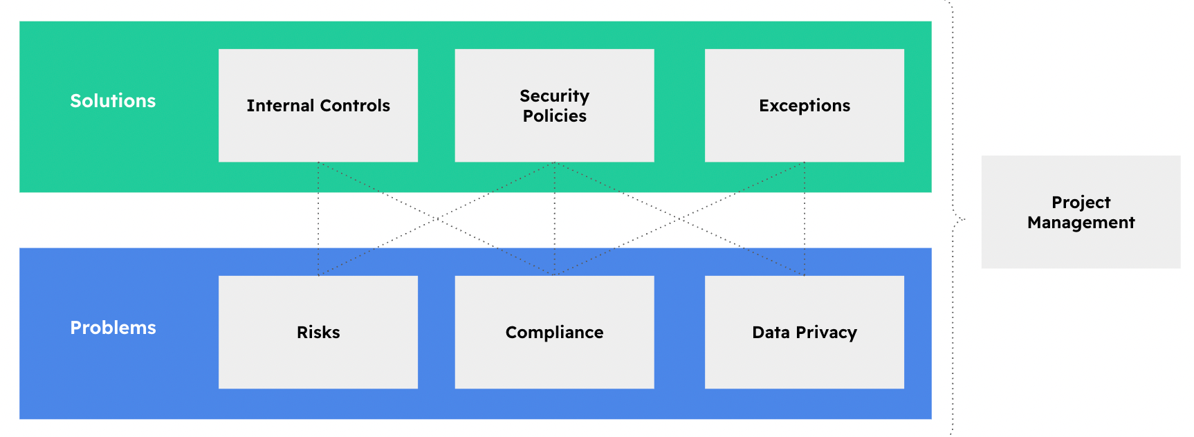 The diagram above is part of a larger framework within eramba known as "Problems & Solutions." Importantly, these same solutions are equally applicable to Risks and Data Flows.