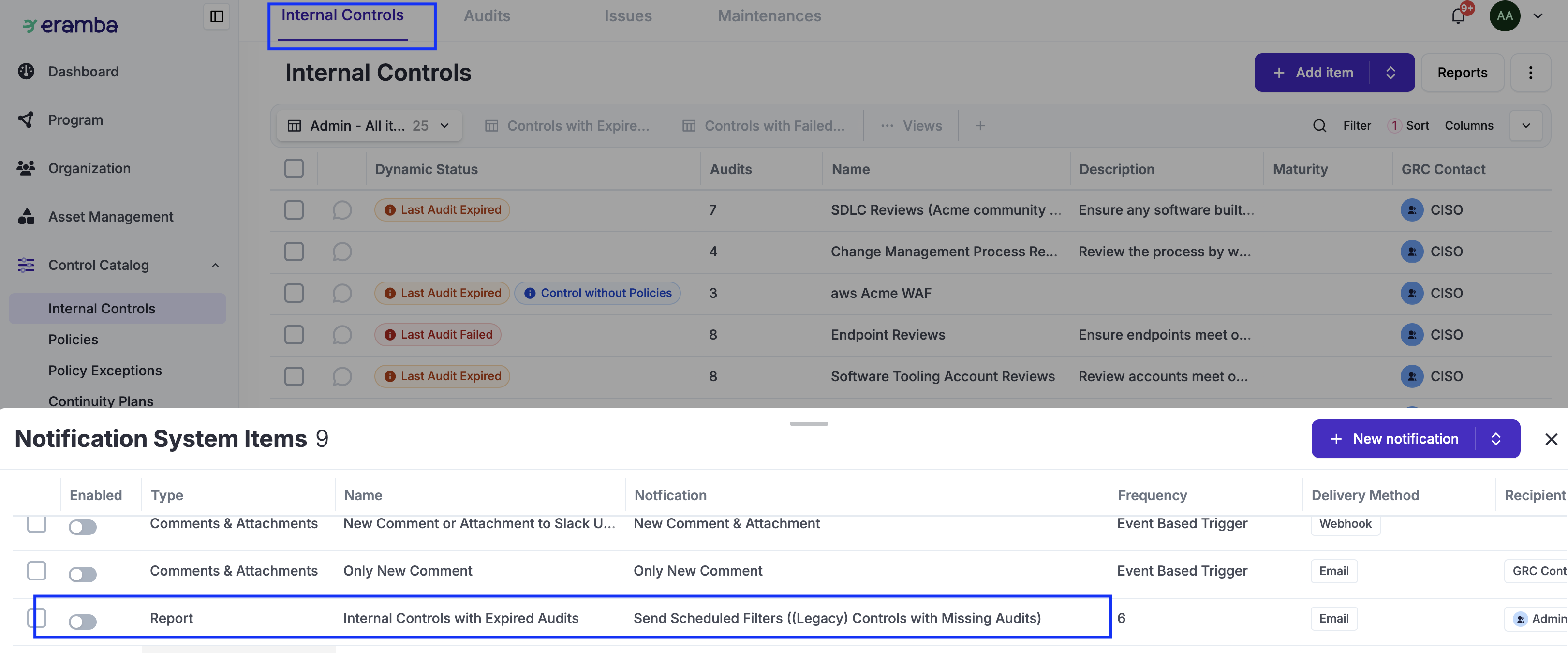 Enable the pre-defined report notifications; do not forget to adjust the recipient (typically your GRC group) and the frequency.