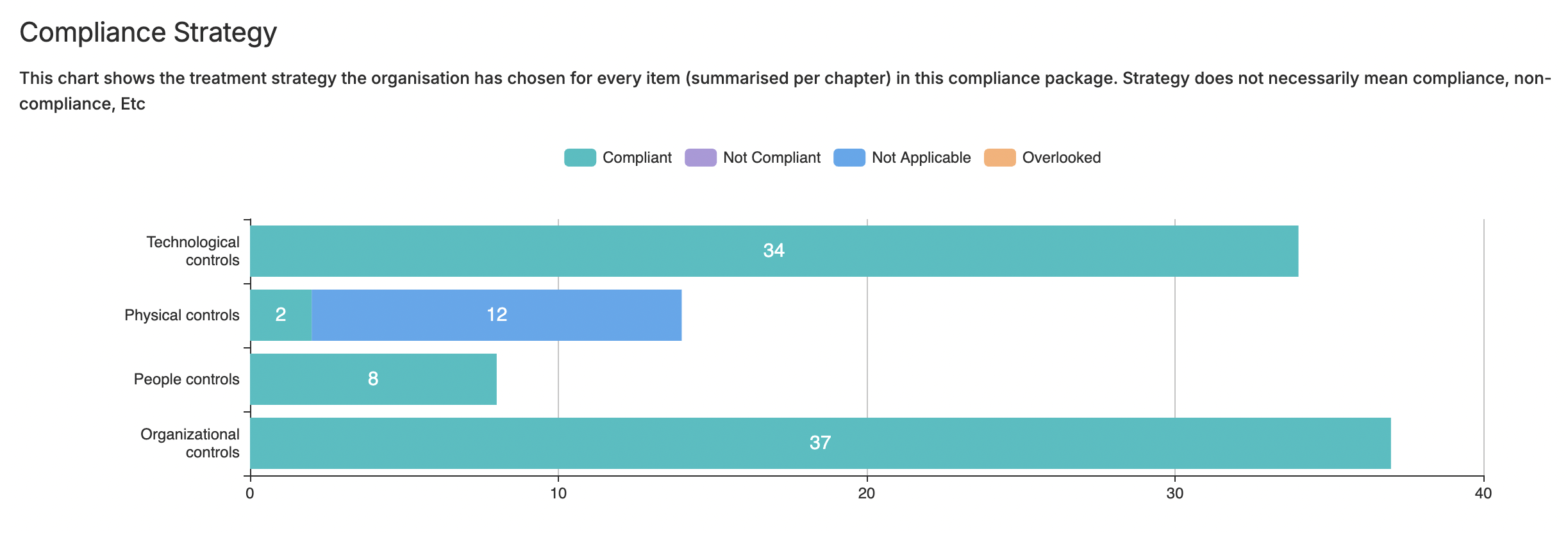 There are multiple charts that will display the progress of your implementation, in particular “Compliance Strategy.” If you followed our analysis, you would have only switched the strategy to “Compliant” for those items where you identified solutions, leaving all others incomplete. This will highlight how much work remains.