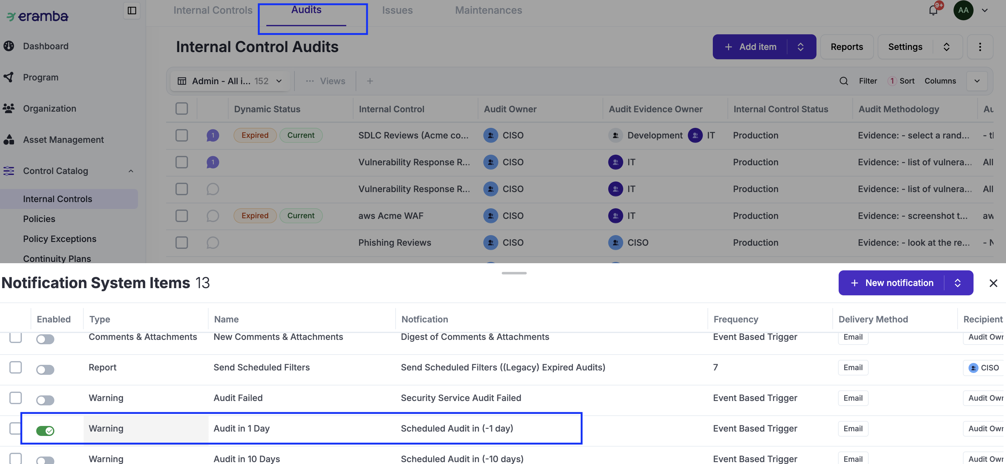 In order to complete these tasks, you need to understand how Internal Controls and in particular Audits work in detail. Our recommendation is that you always start with a “dummy” control to test your understanding of the module and its notifications, and only once you feel comfortable.