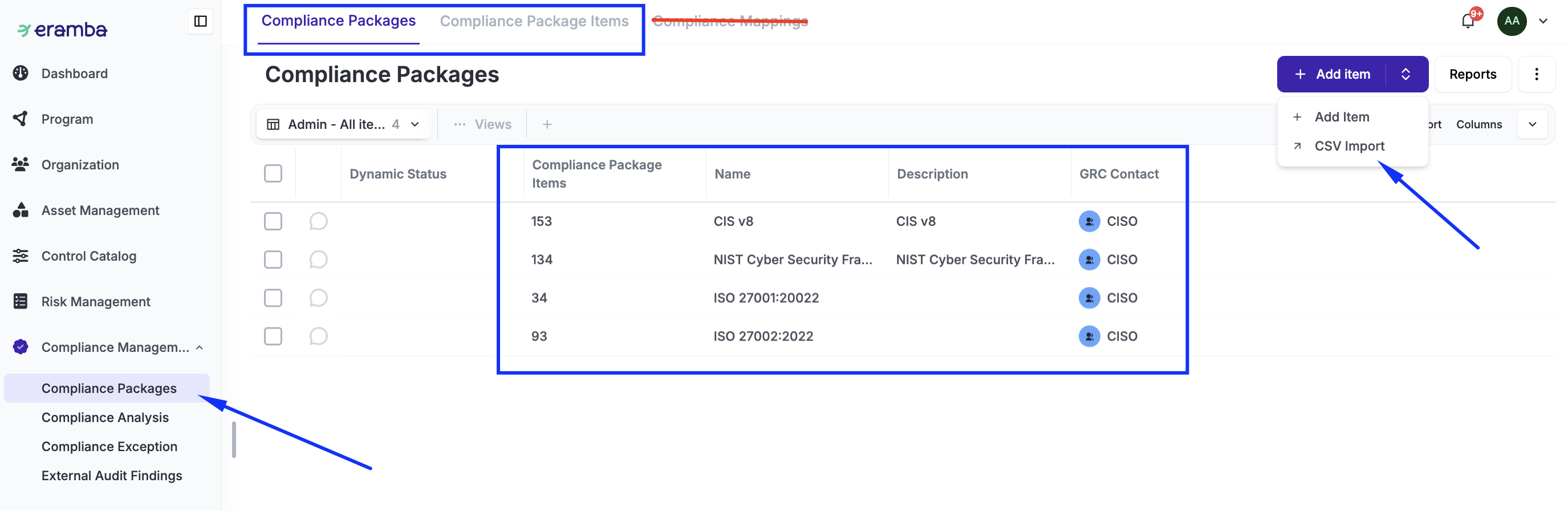 Under Compliance Management / Compliance Packages, you will be able to import CSV files that include the frameworks you want to work with.