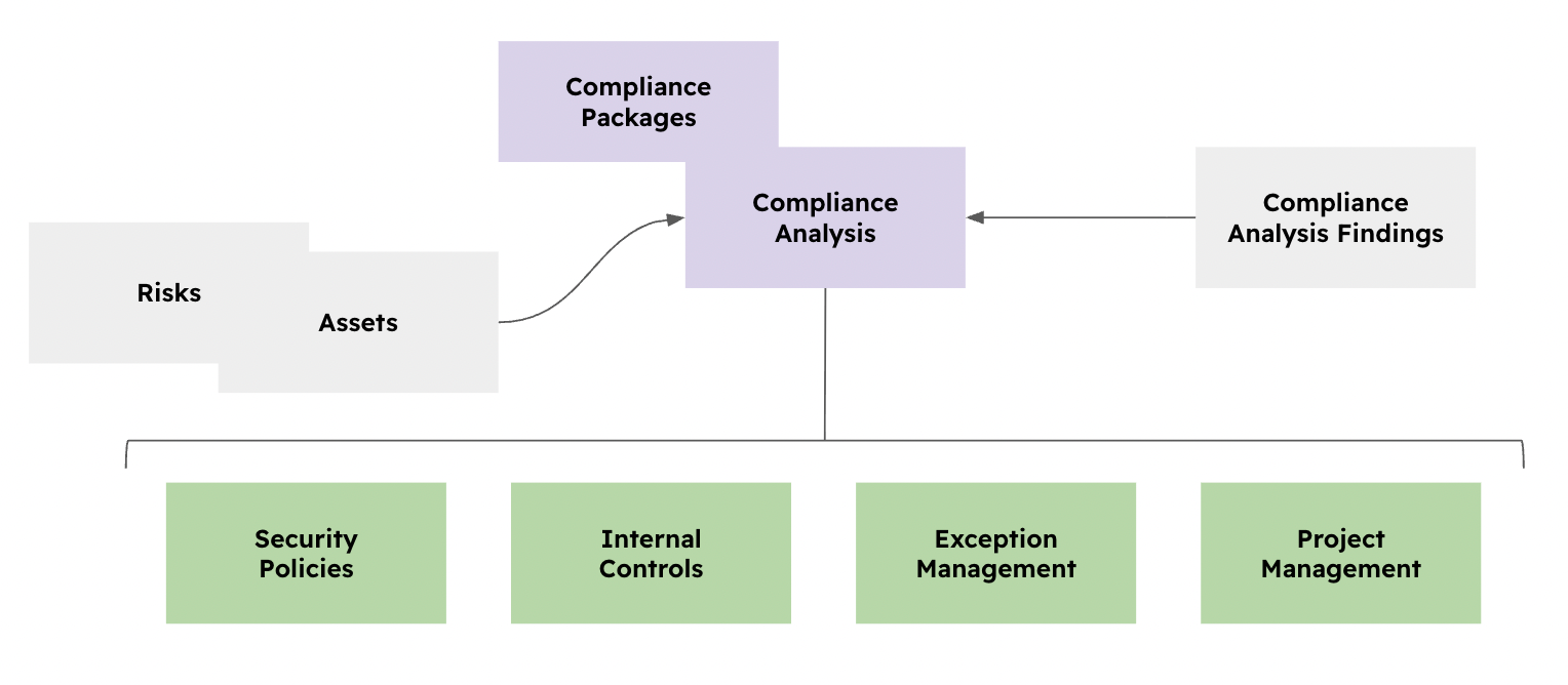 The Compliance Management / Compliance Packages module serves as the central library for actual compliance requirements (such as NIST, SOC, or SOX). The Compliance analysis module is then used to link these requirements from the library to other modules within the system.